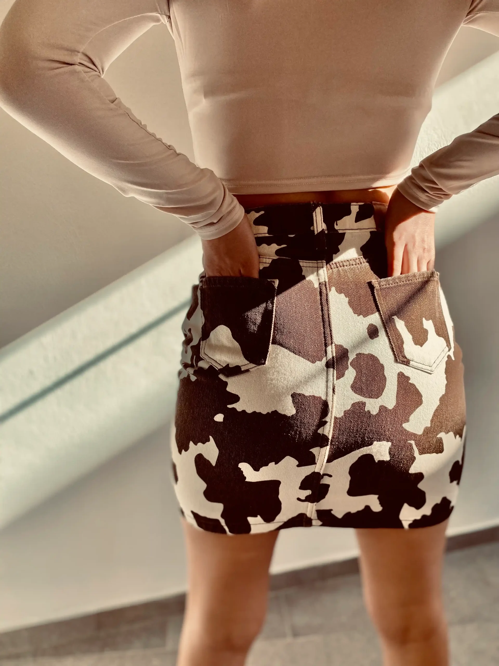 Cow printed mini denim φούστα. Ξεκάθαρα statement piece. Φοριέται χειμώνα-καλοκαίρι. Σταθερό ύφασμα.