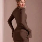 Mini φόρεμα σε καφέ ψυχρή απόχρωση με καμπάνα μανίκι και κόψιμο στον αριστερό ώμο.