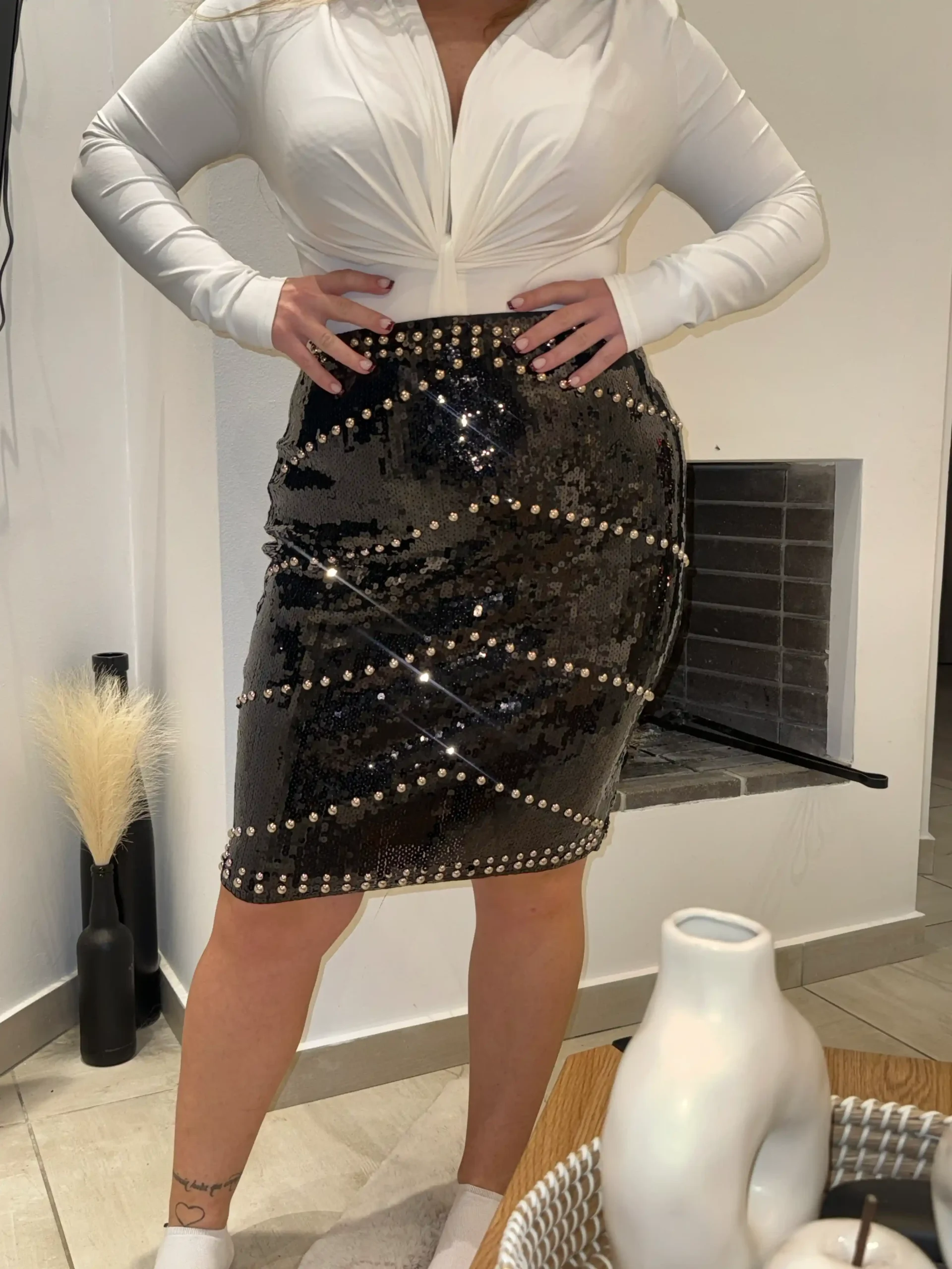 Statement φούστα με ολόκληρη παγιέτα και ασημένια τρούξ που τραβάνε το φως σε κάθε κίνηση. Αγκαλιάζει τη μέση και τους γοφούς με δυναμική, sexy εφαρμογή.
