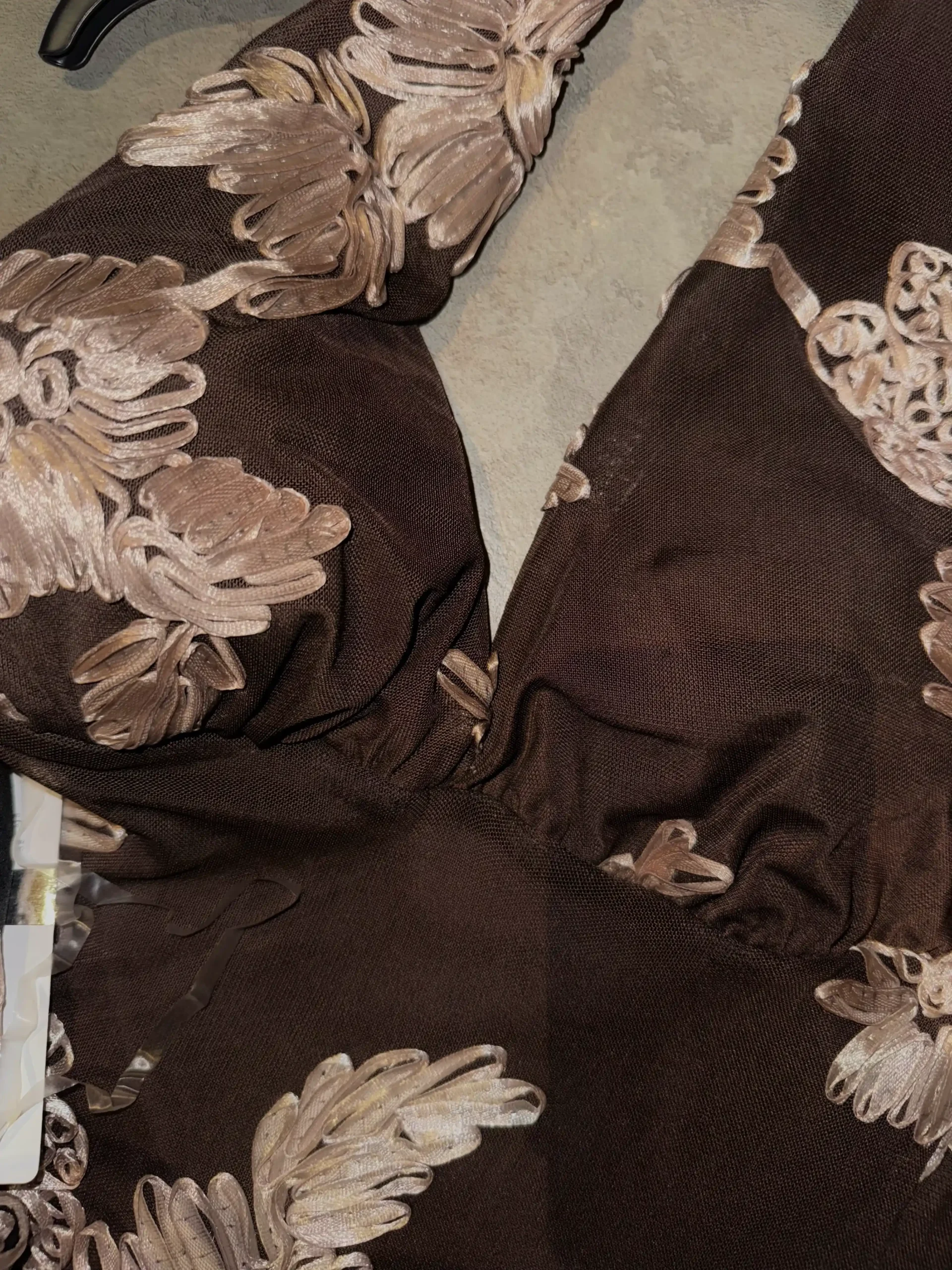 Φόρεμα με μπαλκονέ μπούστο που θυμίζει την εποχή του old Hollywood, τότε που η θηλυκότητα δεν φώναζε αλλά μαγνήτιζε. Η γραμμή αγκαλιάζει το σώμα απαλά, ενώ τα κεντημένα λουλούδια δίνουν βάθος και μια αίσθηση πολυτέλειας άλλης εποχής.