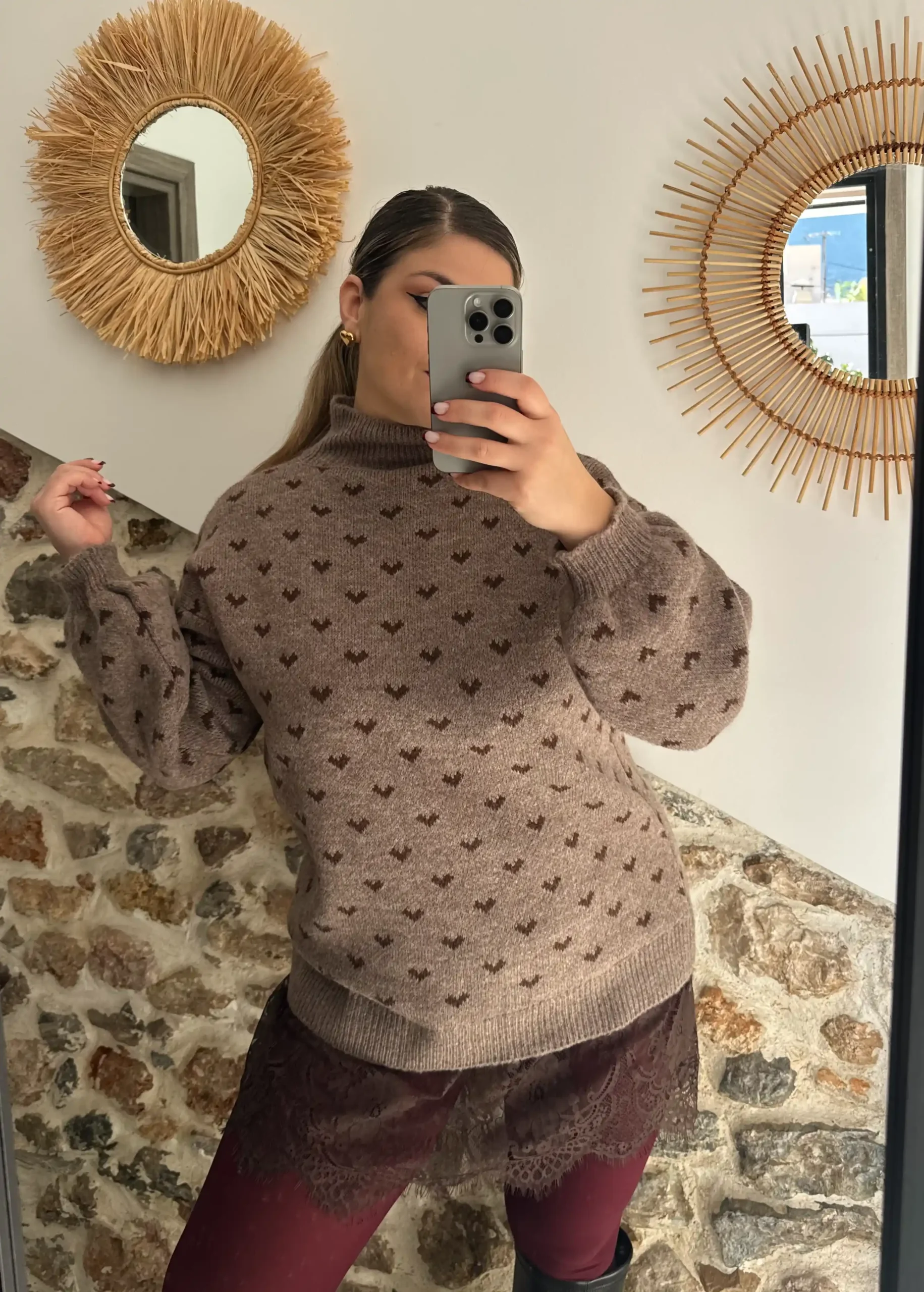 Ένα πλεκτό που συνδυάζει άνεση και λεπτομέρεια. Μαλακό ύφασμα με χαλαρή πλέξη που πέφτει όμορφα στο σώμα, χωρίς να βαραίνει και χωρίς να κολλάει. Η γραμμή του είναι άνετη και κολακευτική, ιδανική για καθημερινές εμφανίσεις που θέλουν στιλ χωρίς προσπάθεια.