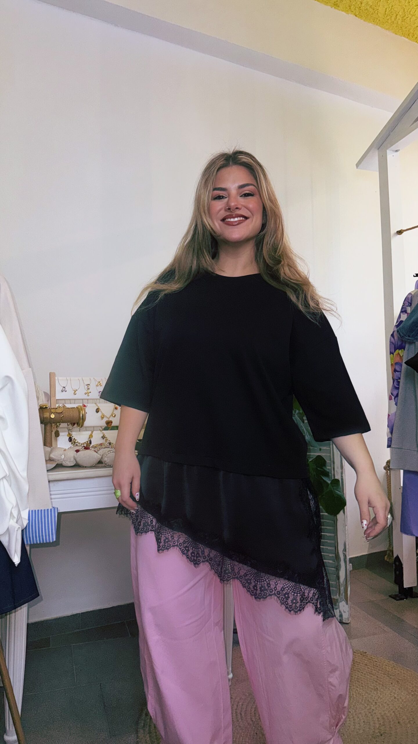 Η relaxed oversized γραμμή του δίνει αυτή την effortless άνεση που θέλεις κάθε μέρα, ενώ η δαντελένια λεπτομέρεια στο τελείωμα φέρνει μια απαλή, θηλυκή αντίθεση που το κάνει να ξεχωρίζει χωρίς προσπάθεια.