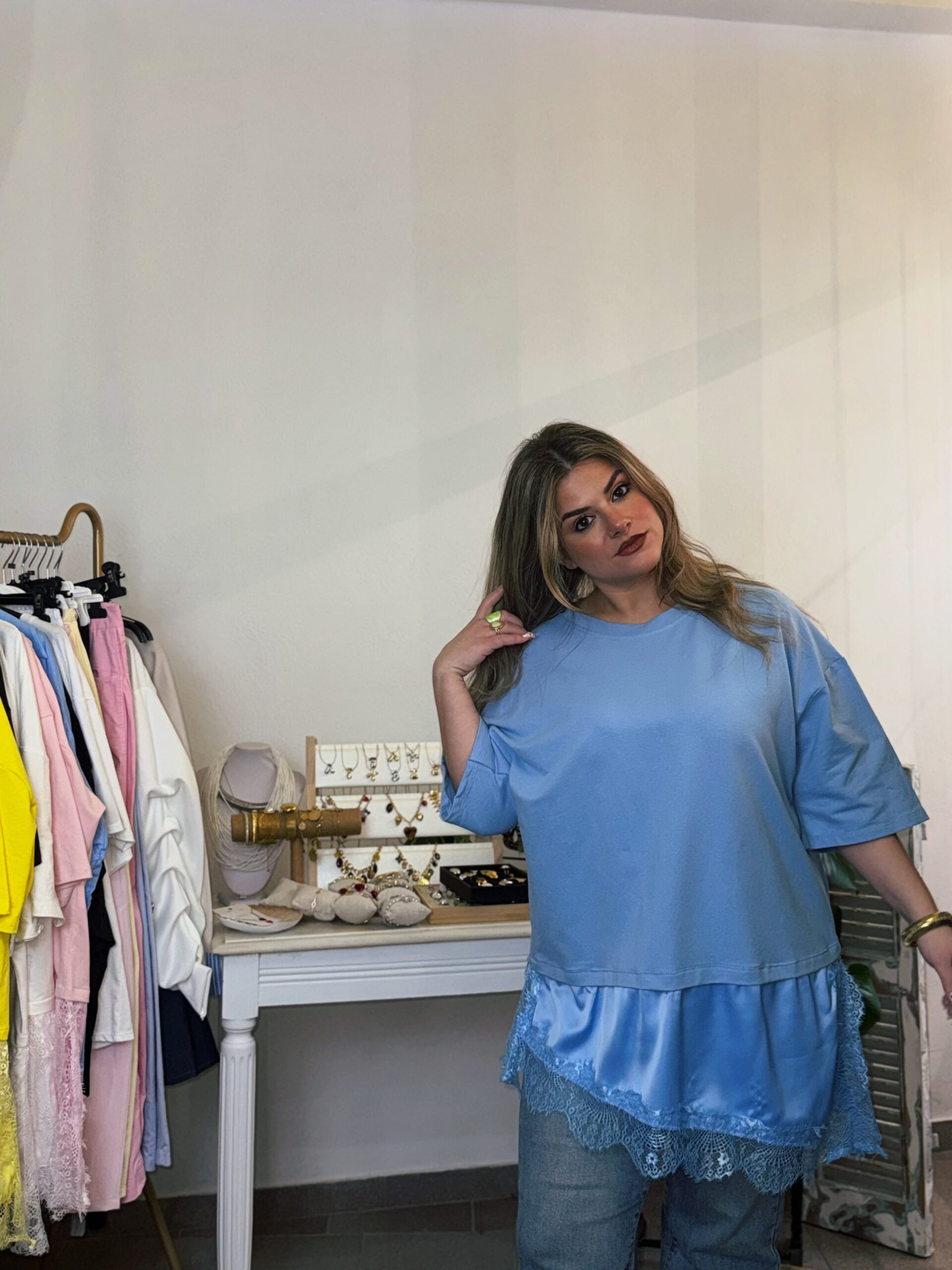Η relaxed oversized γραμμή του δίνει αυτή την effortless άνεση που θέλεις κάθε μέρα, ενώ η δαντελένια λεπτομέρεια στο τελείωμα φέρνει μια απαλή, θηλυκή αντίθεση που το κάνει να ξεχωρίζει χωρίς προσπάθεια.