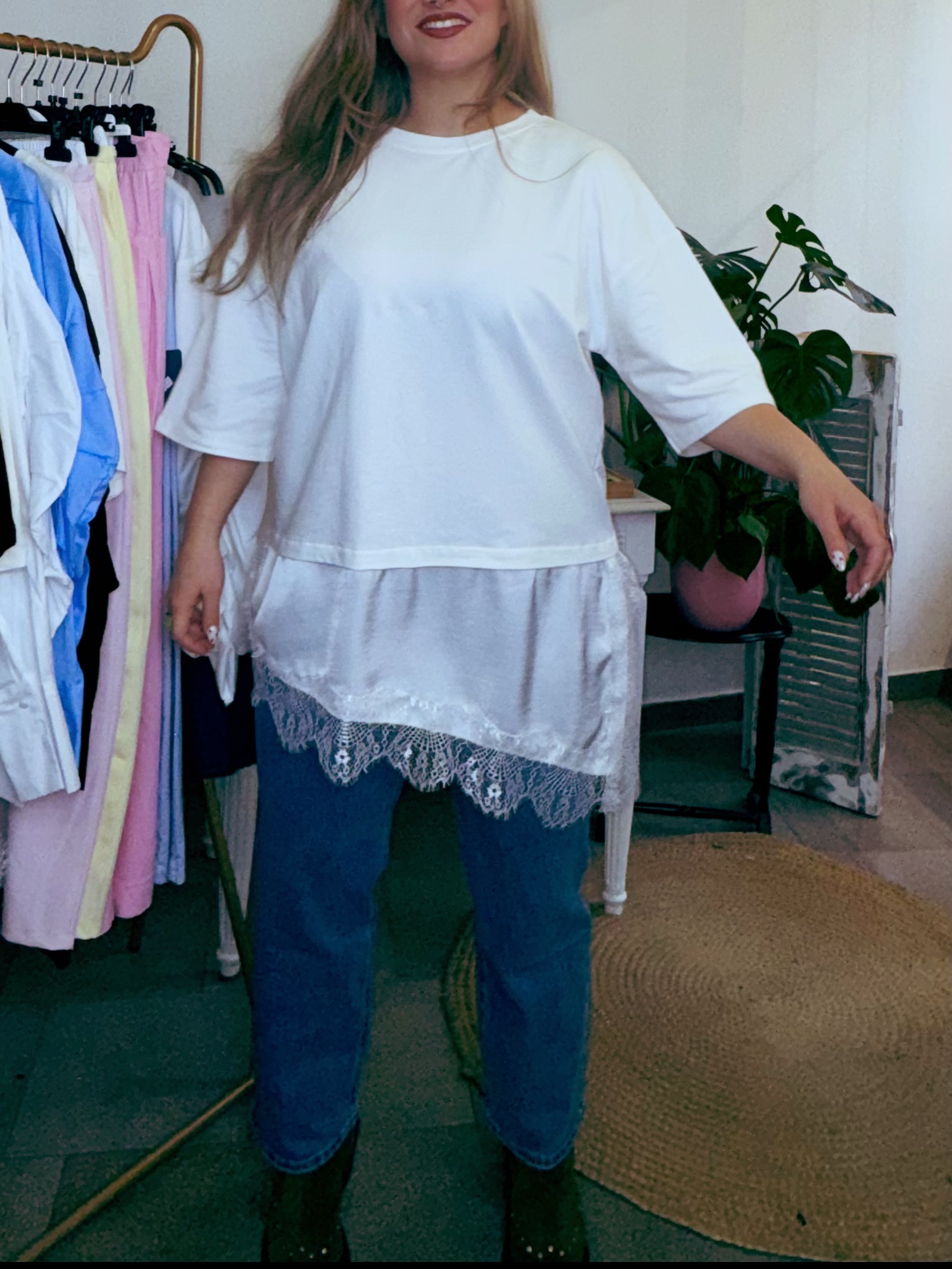 Η relaxed oversized γραμμή του δίνει αυτή την effortless άνεση που θέλεις κάθε μέρα, ενώ η δαντελένια λεπτομέρεια στο τελείωμα φέρνει μια απαλή, θηλυκή αντίθεση που το κάνει να ξεχωρίζει χωρίς προσπάθεια.