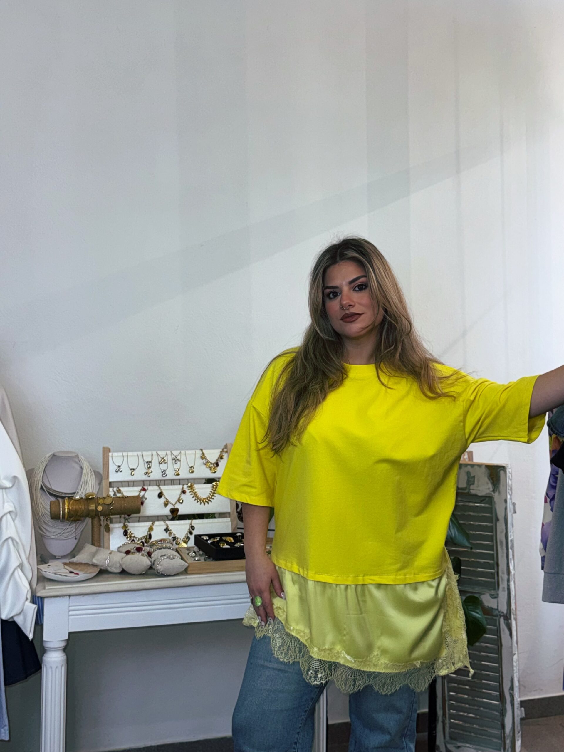 Η relaxed oversized γραμμή του δίνει αυτή την effortless άνεση που θέλεις κάθε μέρα, ενώ η δαντελένια λεπτομέρεια στο τελείωμα φέρνει μια απαλή, θηλυκή αντίθεση που το κάνει να ξεχωρίζει χωρίς προσπάθεια.