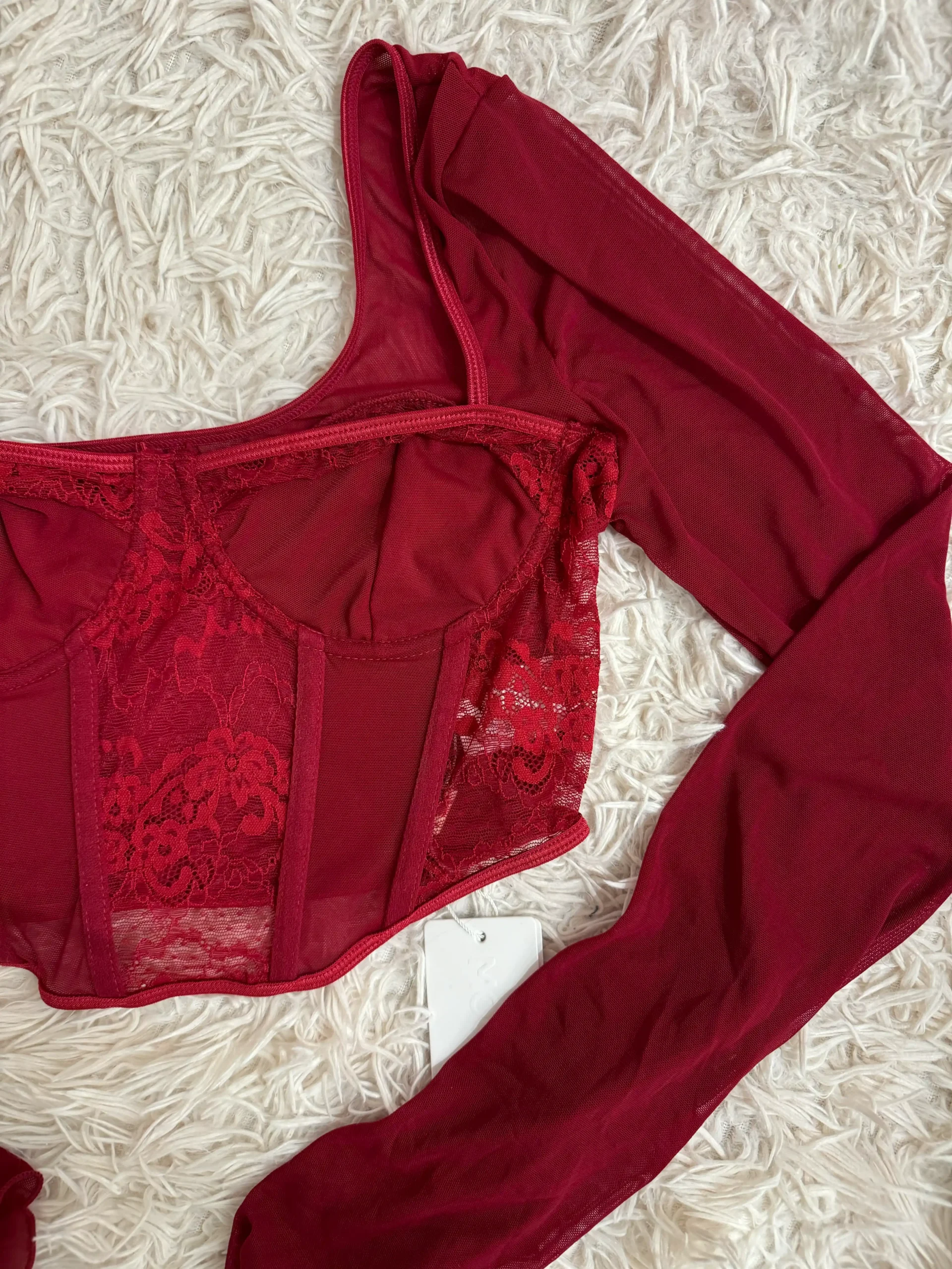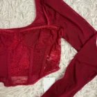 Corset top με μπαλκονέ μπούστο και δαντέλα που παίζει ανάμεσα στο lingerie και το fashion. Αγκαλιάζει σωστά, αναδεικνύει το στήθος και δίνει σχήμα χωρίς υπερβολή. Τα μακριά, διάφανα μανίκια ισορροπούν το look και το κάνουν ιδανικό από βραδινή έξοδο μέχρι statement outfit με τζιν.